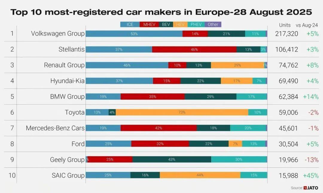 汽車統計咨詢機構JATO Dynamics數據顯示,8月歐洲28國乘用車銷量前十的車企中,大眾以21.7萬輛的成績,在8月歐洲28國乘用車車企中排名第一,其53%的銷量來自燃油車,14%為輕度混動車型,11%為插電式混合動力車型,純電車型的占比僅有21%。