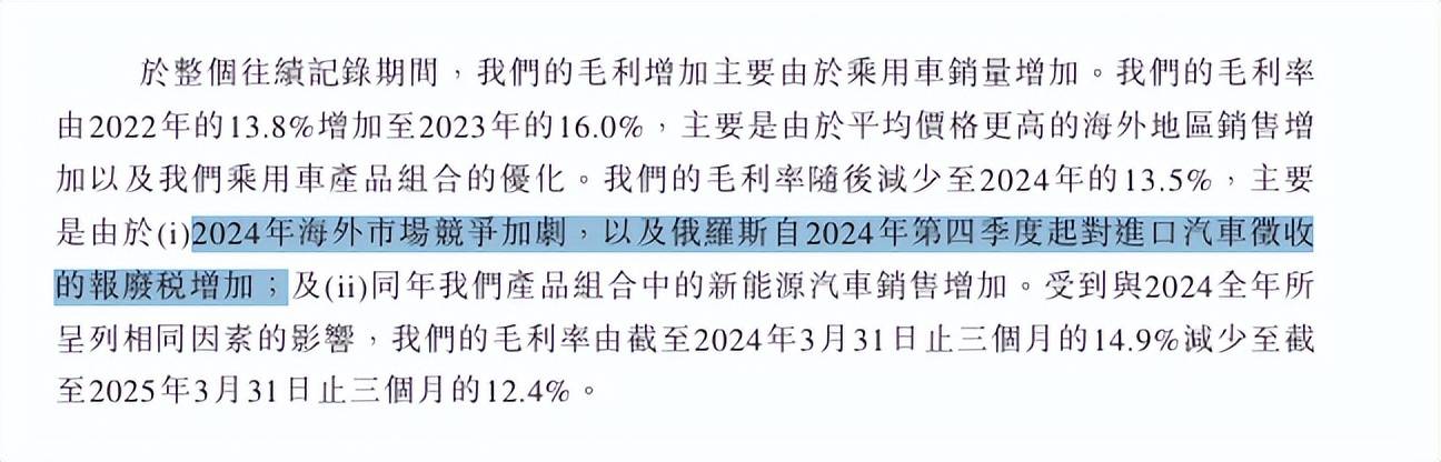 此前,奇瑞汽車在港交所遞交的招股書中表示,奇瑞計劃縮減俄羅斯的業(yè)務(wù)及銷售規(guī)模,降低制裁風(fēng)險,包括逐步縮減在俄羅斯的布局,減少對俄羅斯的銷售;同時,奇瑞還表示,由于2024年第四季度起俄羅斯增加對進(jìn)口汽車的報廢稅,導(dǎo)致毛利率減少。