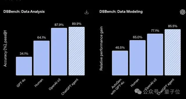 在 DSBench? 測試中,該測試旨在評估智能體在涵蓋數據分析和建模等現實數據科學任務中的表現,ChatGPT 智能體顯著超越了之前的最先進模型。