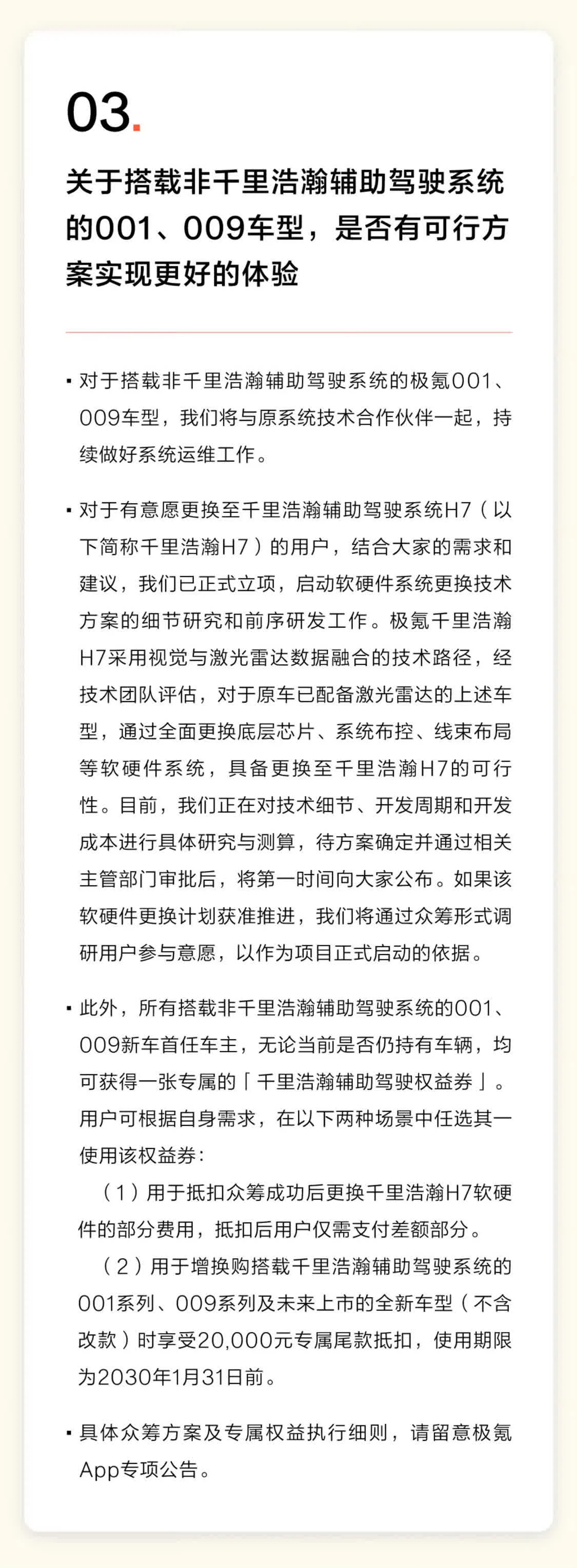 對于有意愿更換至千里浩瀚輔助駕駛系統 H7(以下簡稱千里浩瀚 H7)的用戶,結合大家的需求和建議,我們已正式立項,啟動軟硬件系統更換技術方案的細節研究和前序研發工作。極氪千里浩瀚 H7 采用視覺與激光雷達數據融合的技術路徑,經技術團隊評估,對于原車已配備激光雷達的上述車型,通過全面更換底層芯片、系統布控、線束布局等軟硬件系統,具備更換至千里浩瀚 H7 的可行性。目前,我們正在對技術細節、開發周期和開發成本進行具體研究與測算,待方案確定并通過相關主管部門審批后,將第一時間向大家公布。如果該軟硬件更換計劃獲準推進,我們將通過眾籌形式調研用戶參與意愿,以作為項目正式啟動的依據。